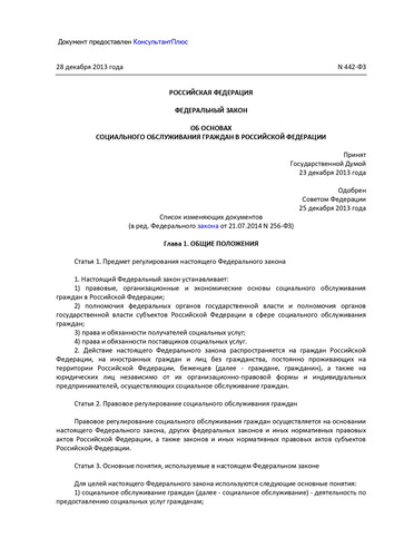 ФЗ Об основах социального обслуживания граждан в РФ от 28.12.2013 г. N 442-ФЗ
